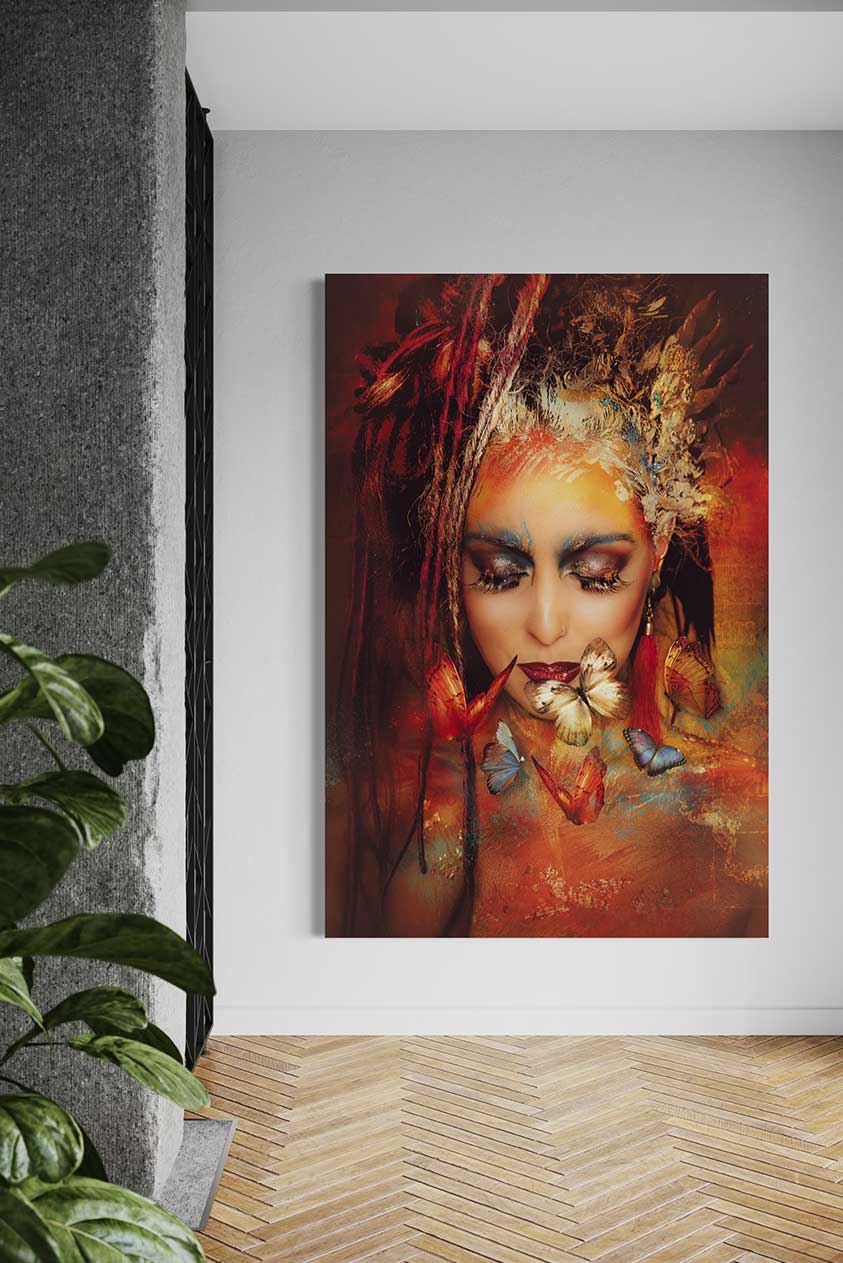 € 74,00 - € 489,00Prijsklasse: € 74,00 tot € 489,00Butterfly Dream vangt de kracht van transformatie en schoonheid in een kleurrijk en mysterieus kunstportret.