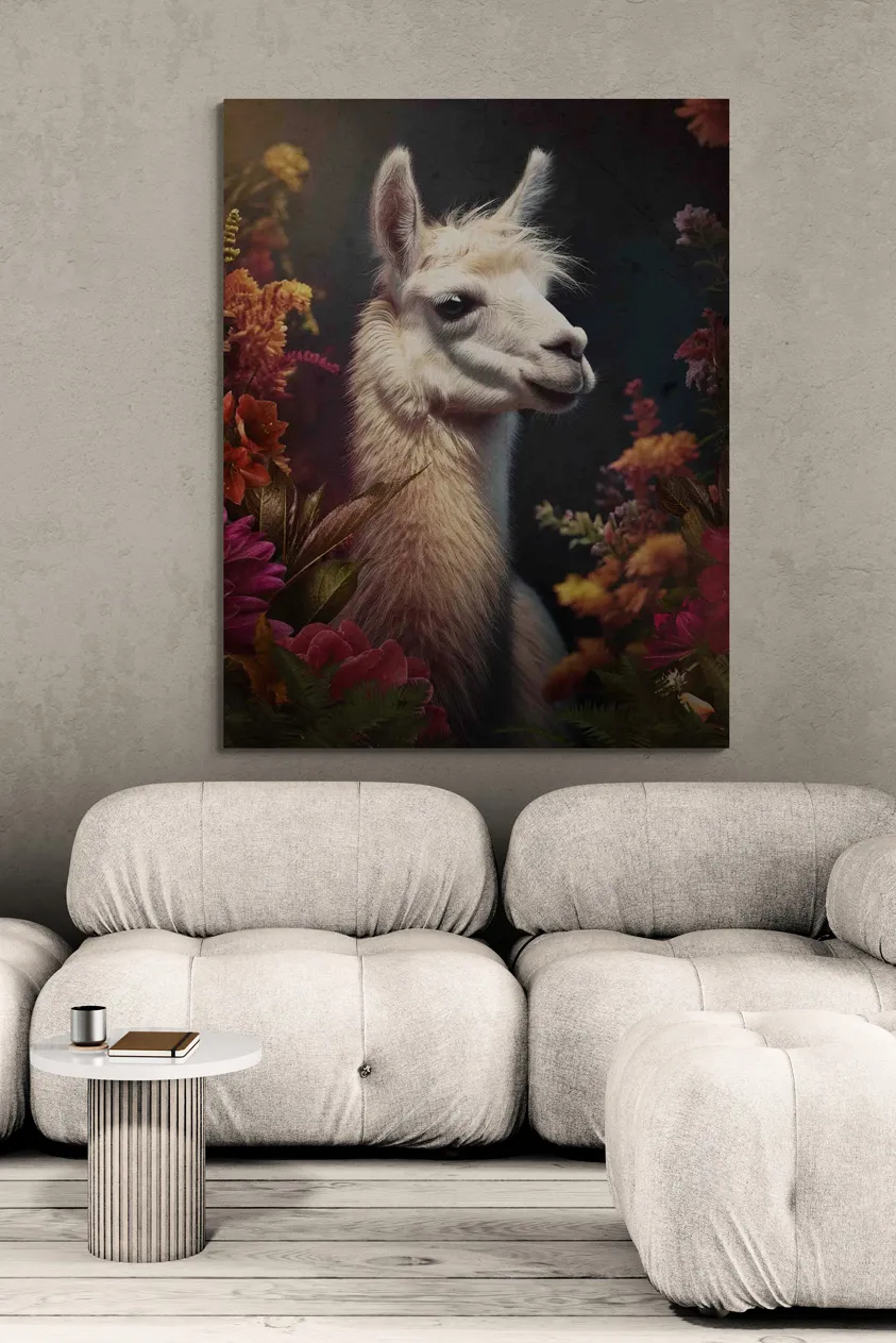 € 74,00 - € 489,00Prijsklasse: € 74,00 tot € 489,00Breng een glimlach in je interieur met dit prachtige kunstwerk van een charmante lama, omringd door een kleurrijke bloemenpracht.