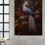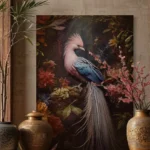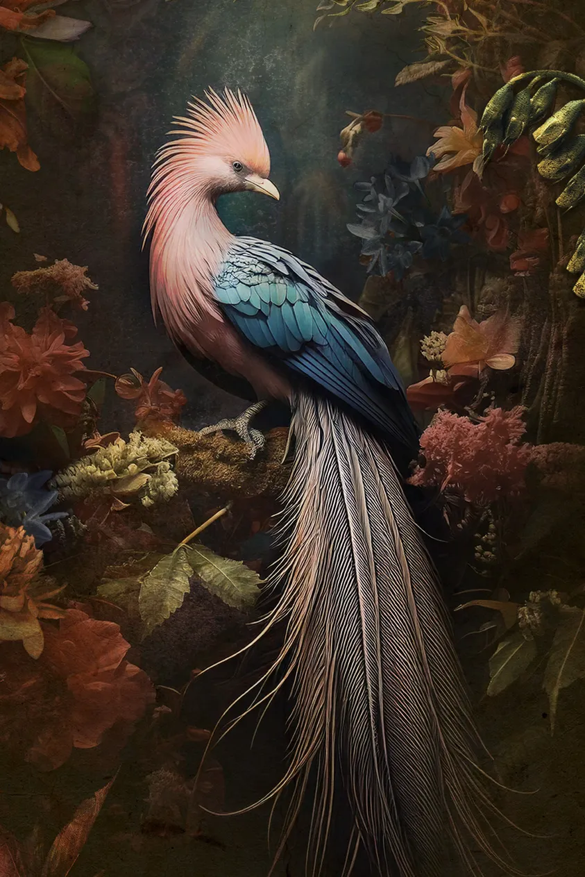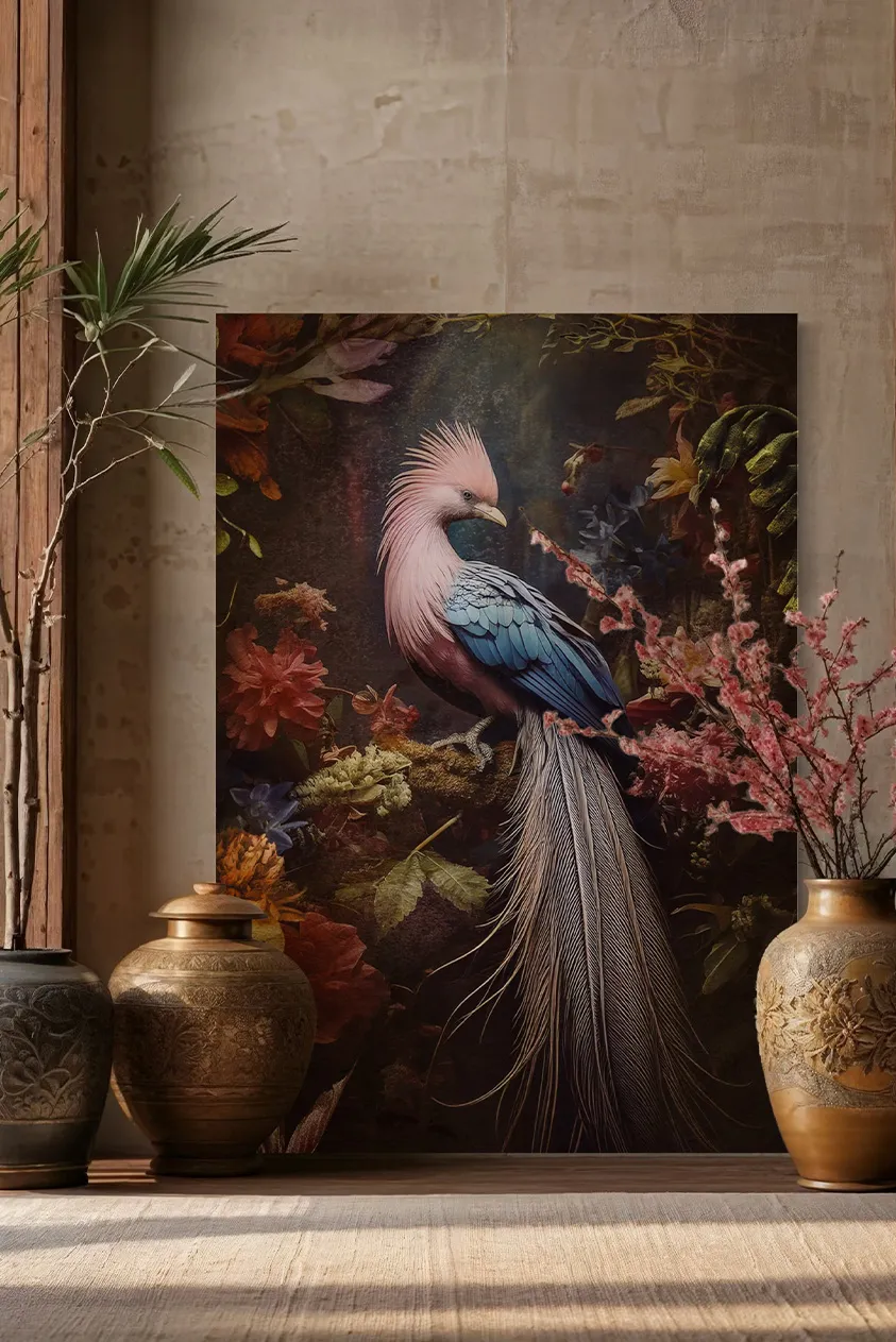 Laat je betoveren door dit indrukwekkende kunstwerk van een elegante tropische vogel, met zachte roze en blauwe tinten, afgebeeld tegen een weelderige achtergrond vol bloemen en bladeren.
