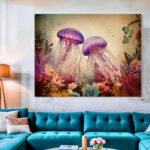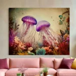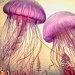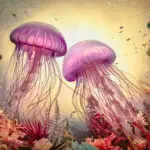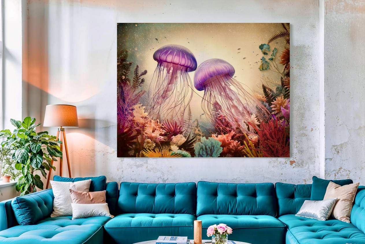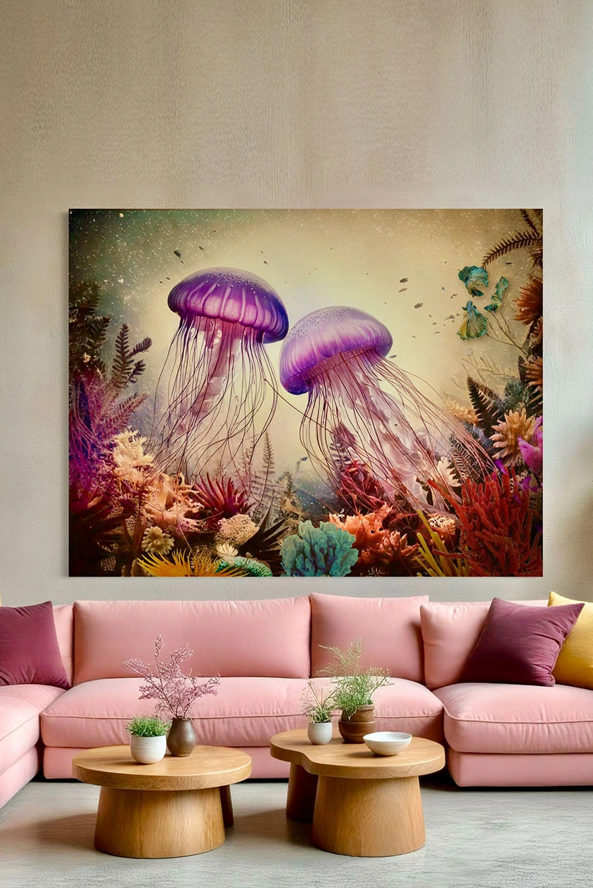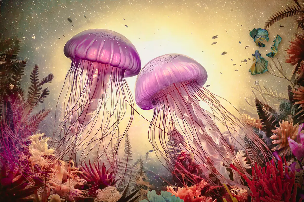 Dans van de Kwallen neemt je mee naar een betoverende onderwaterwereld, waar twee elegante paarse kwallen gewichtloos door een zee van licht en kleur bewegen.