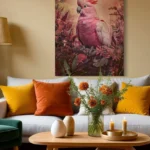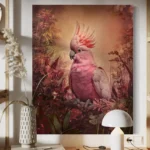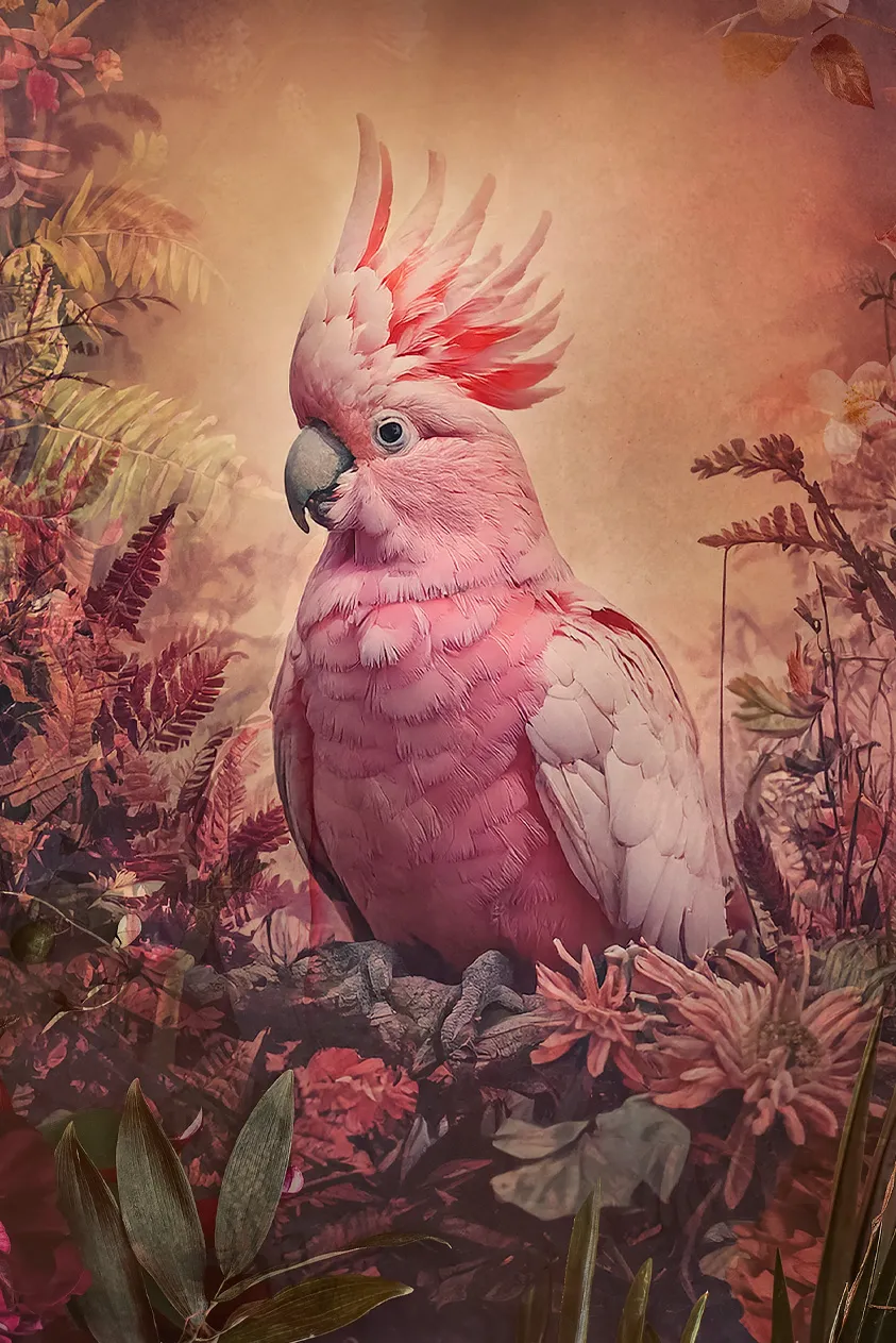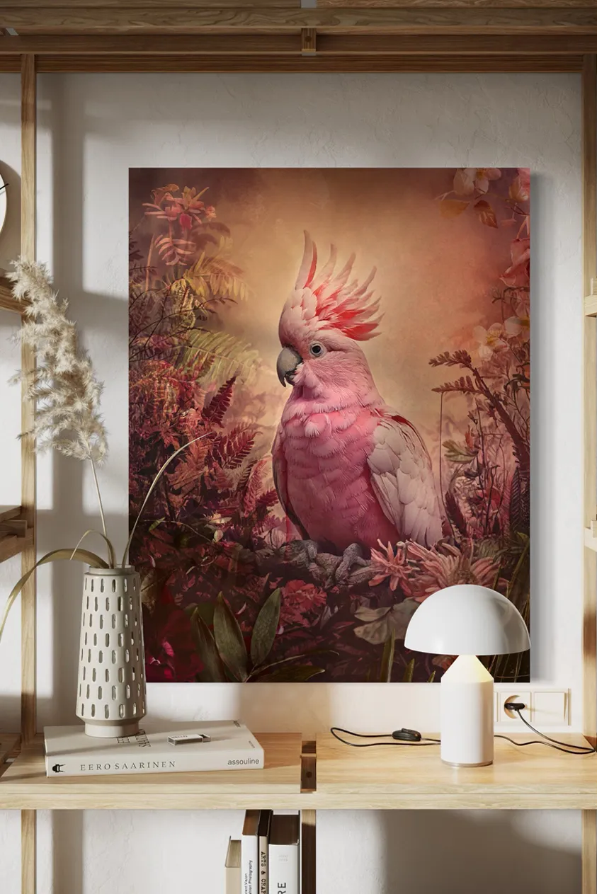 Breng exotische schoonheid in je interieur met de roze kaketoe tussen bloemen – een sprankelend kunstwerk op plexiglas of dibond.